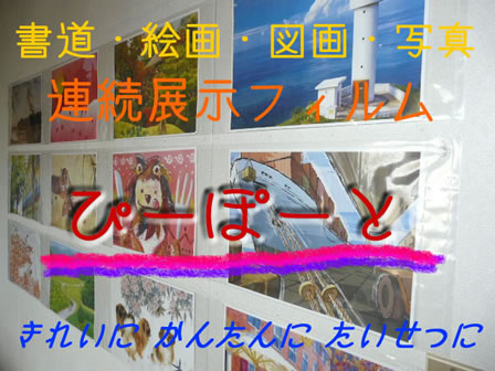「「ぴーぽーと」とは、書道・絵画・図画・写真など特に紙に描いた作品を「きれいに展示」「かんたんに設置」「たいせつに保管」できる連続したフィルムケース(透明なビニールケース)のことです。